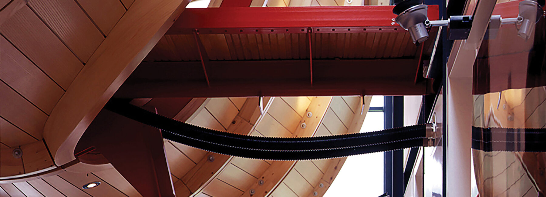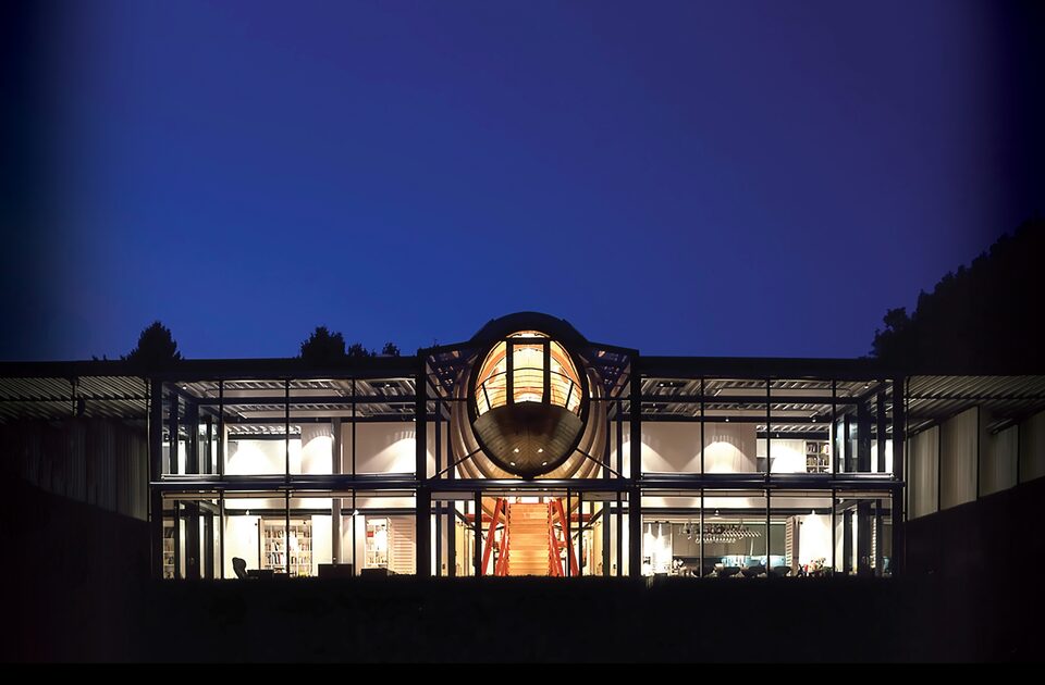 The strength of the simple concept relies on the juxtaposition of the highly crafted spine and the overt industrial detailing of the two accommodation wings. The spine comprises a series of rings formed from laminated softwood and shaped ash supported on tubular steel legs. By contrast, the main body of the house is a clearly expressed steel frame with white plaster panels overlaid by a profiled metal ceiling.